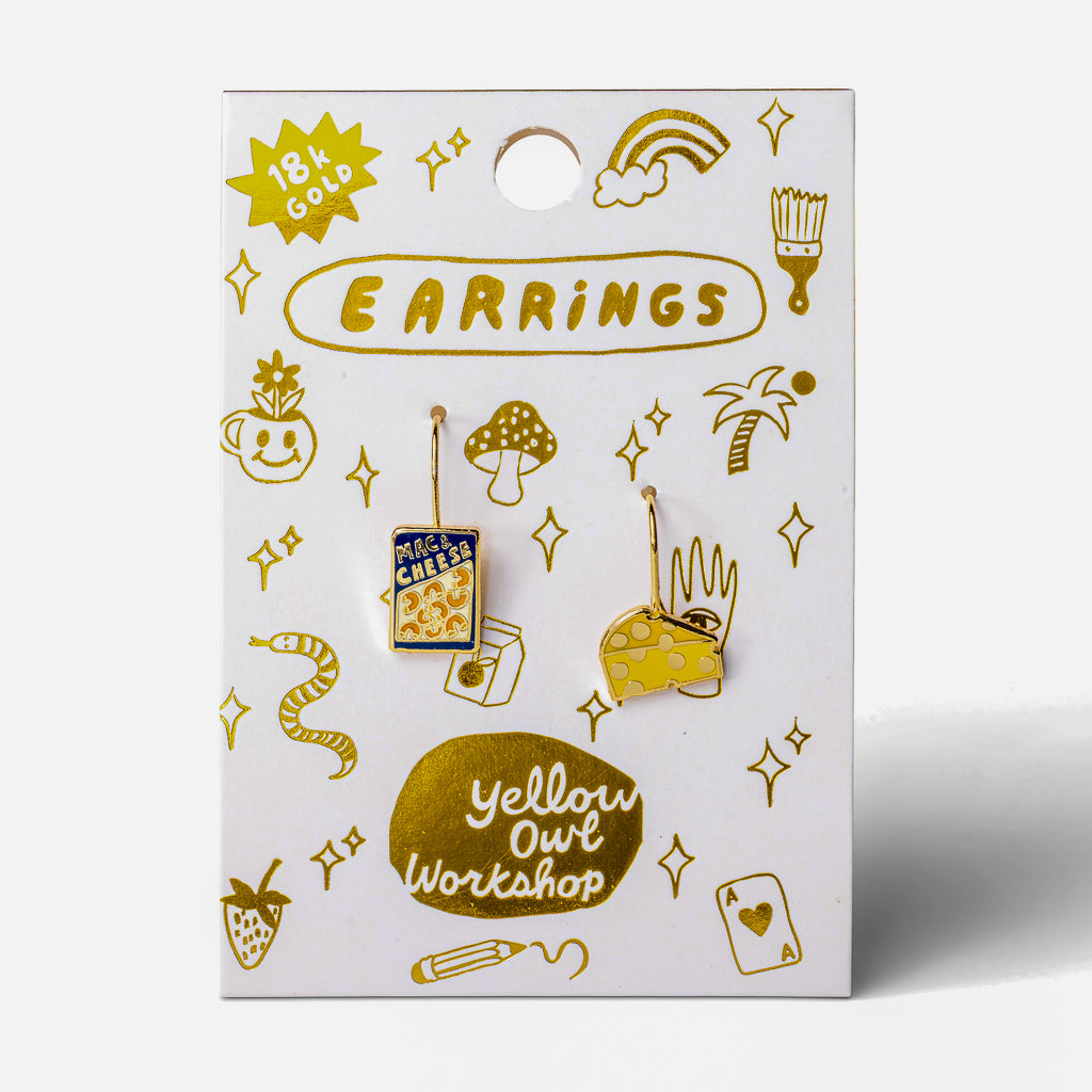 These mac and cheese earrings are playful food jewelry made for people who don’t take their accessories too seriously. Featuring a mismatched mac and cheese box and cheesy wedge, this pair brings bold color and humor to everyday outfits. Lightweight and easy to wear, these food earrings are a fun statement for food lovers and fans of dressing a little cheesy.